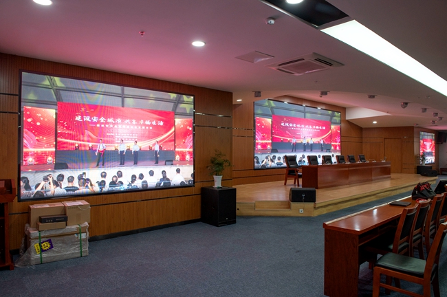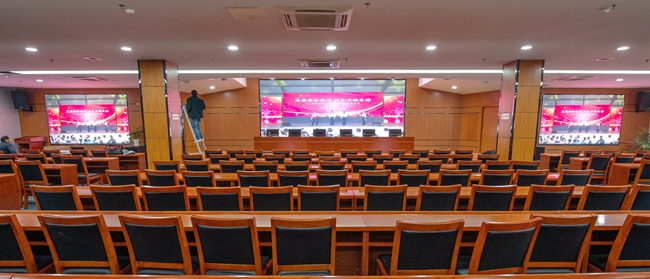 經(jīng)過改造,安全教育館新增3塊LED屏幕,其中主席臺(tái)處主LED顯示屏面積約20平方,東西兩側(cè)輔助LED顯示屏各約6平方。LED屏幕采用顯示單元像素間距為P2-2.5,具有顯示面積大、分辨率高、超高對(duì)比度、超寬視角、無縫拼接、維護(hù)方便等優(yōu)點(diǎn)。改造后進(jìn)一步提升了視頻會(huì)議效果,增加了會(huì)場多功能性。
