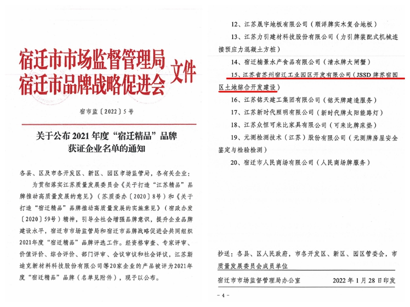 近日,江蘇省蘇州宿遷工業(yè)園區(qū)開發(fā)有限公司(簡稱開發(fā)公司或JSSD)獲得2021年度“宿遷精品”品牌認(rèn)定。