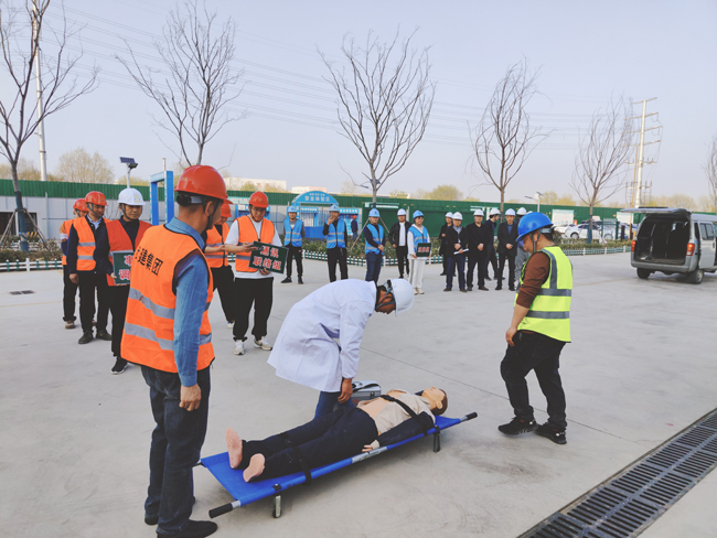本次演練共分6個小組,分別為:現(xiàn)場模擬組、現(xiàn)場警戒(搶修)組、應(yīng)急救援(疏散)組、通訊聯(lián)絡(luò)組、事故調(diào)查組、 觀摩組。假設(shè)工人在生活區(qū)違規(guī)使用大功率電器突發(fā)火災,被煙霧和火勢圍困,二樓有人發(fā)出救援信號,正在附近巡查的安全員發(fā)現(xiàn)情況后,立即趕赴現(xiàn)場并打電話給項目生產(chǎn)負責人,在接到通知后,項目生產(chǎn)負責人迅速安排項目部應(yīng)急救援辦公室負責人,并啟動應(yīng)急預案,各救援小組立即到達現(xiàn)場開展工作,安全員迅速引導全體人員有序從疏散樓梯疏散到安全位置,救援組帶著擔架、急救箱等趕赴現(xiàn)場,將“受傷”人員用擔架從房內(nèi)撤離到安全位置,同時救援醫(yī)生對“受傷”人員進行簡單的心肺復蘇、人工呼吸,并迅速送往醫(yī)院進行治療。