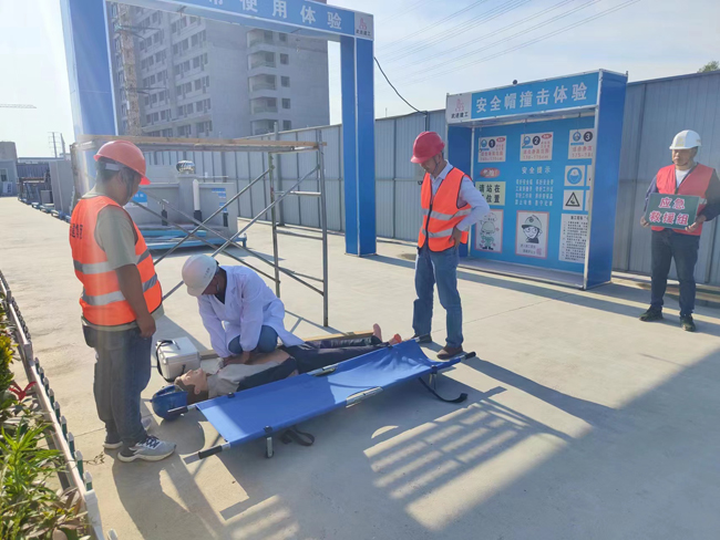 此次演練模擬一名內(nèi)墻抹灰人員在場地上行走, 突然有木方從高處墜落,造成物體打擊?,F(xiàn)場立即撥打120請求救援,同時立即通知各救援小組趕赴現(xiàn)場啟動應(yīng)急預(yù)案,停止現(xiàn)場施工作業(yè),封鎖事故現(xiàn)場,注意保護好受傷人員,防止造成二次傷害。隨后,120救護車在救援組人員的帶領(lǐng)下來到工地,直接進入事故現(xiàn)場,檢查傷員受傷情況。經(jīng)醫(yī)護人員包扎處理后,受傷人員被迅速用擔(dān)架抬上救護車,并送往醫(yī)院進行救治。