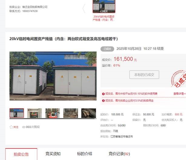 近日,城發(fā)公司青年公寓臨時(shí)電項(xiàng)目一批閑置資產(chǎn)在中拍平臺公開拍賣,經(jīng)過27分鐘的緊張激烈競價(jià),最終以161500元成交標(biāo)的,比評估價(jià)100500元高出61000元,溢價(jià)率61%。